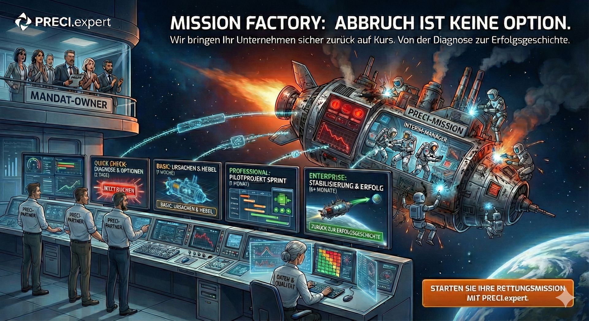 „Unser Ziel ist es, gemeinsam mit Ihrer Crew das angeschlagene ‚Raumschiff' wieder in eine stabile Bahn zu bringen – und so Ihre Erfolgsgeschichte zu schreiben."